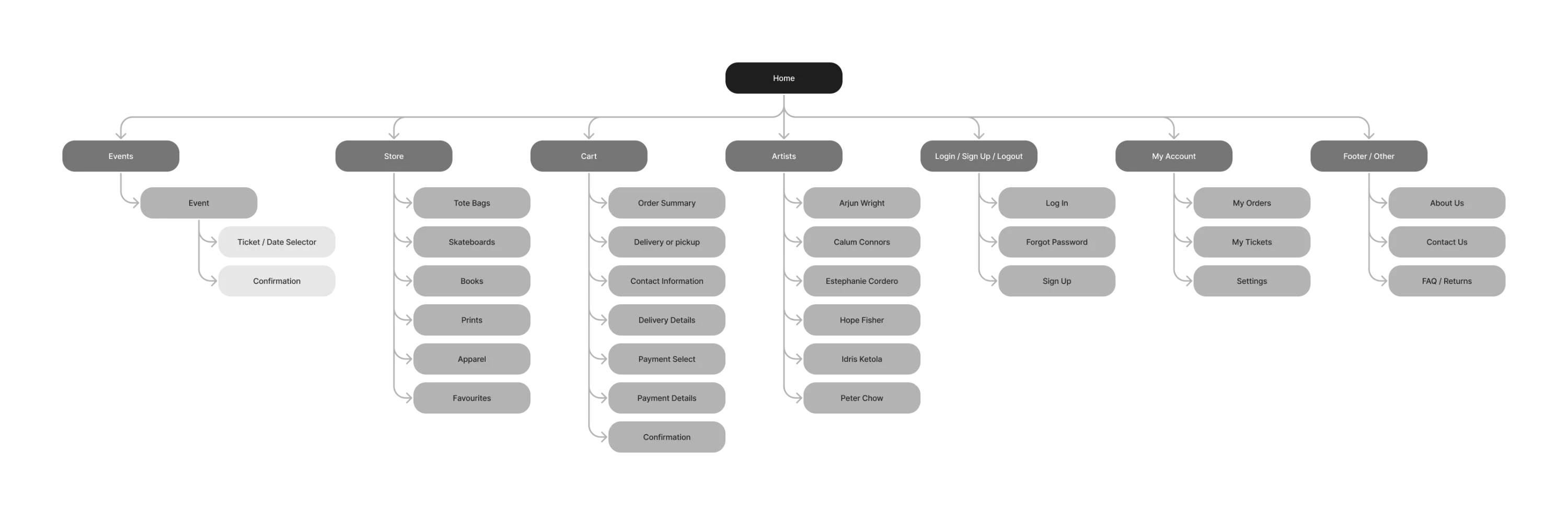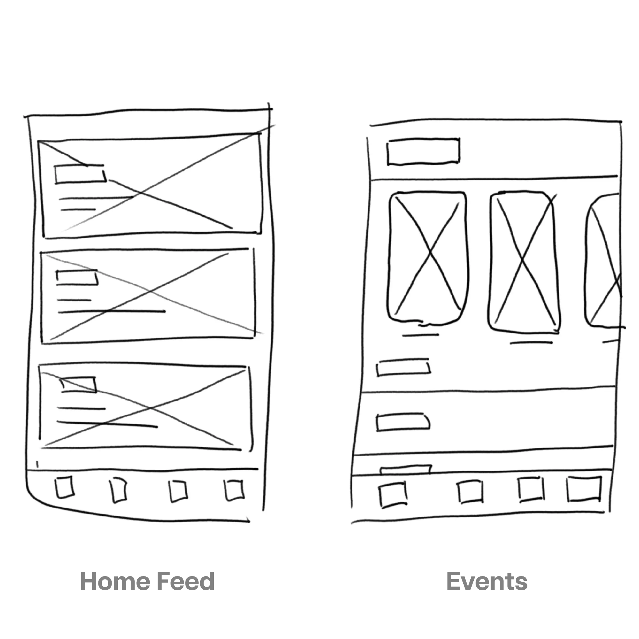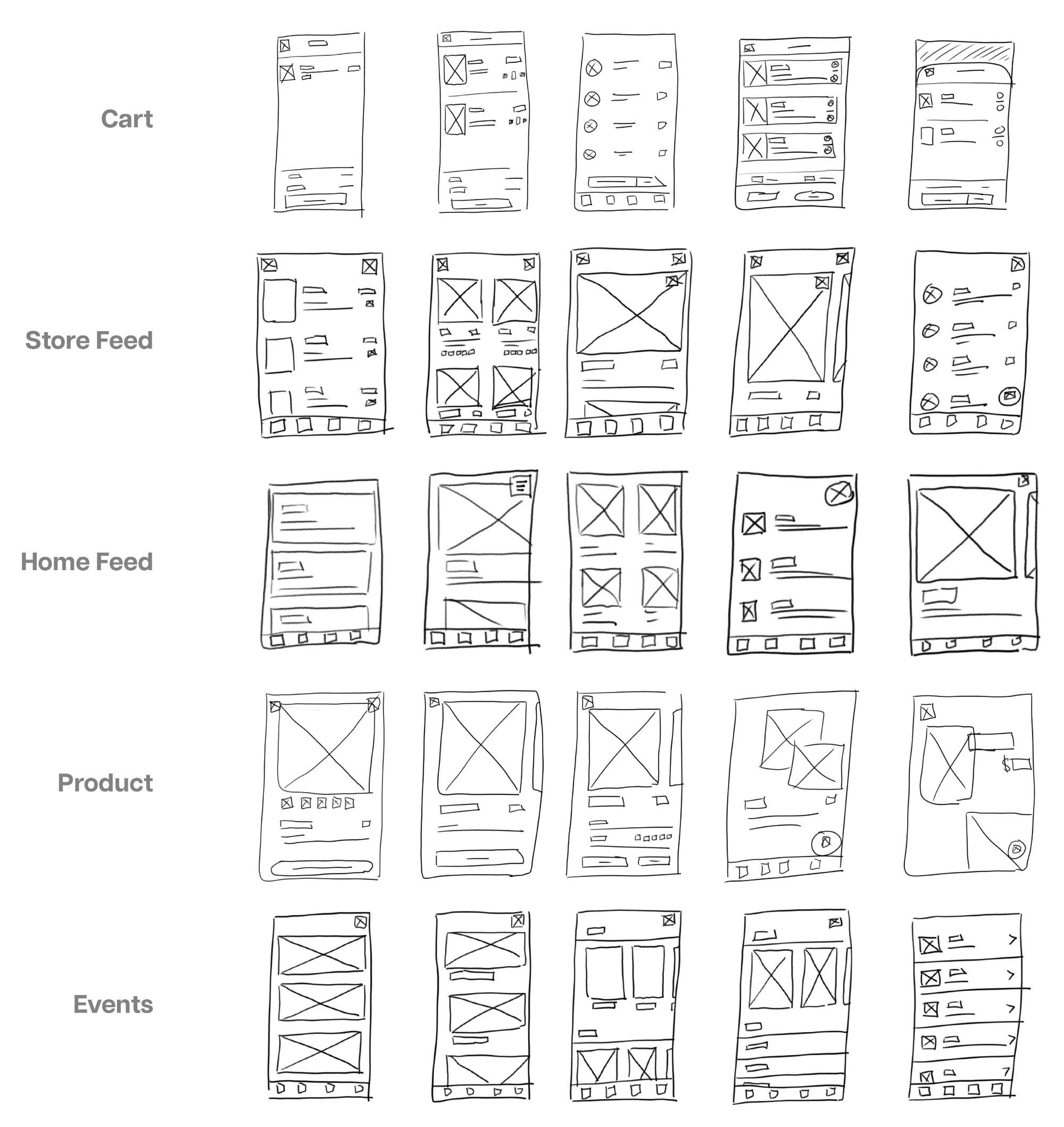 Simple and quick, we started the process with paper wireframes. They’re a great way quickly iterate initial ideas. We brainstormed variations of some of the main screens, like the home page, store, and events page. These paper wireframes set a foundation for low fidelity designs.