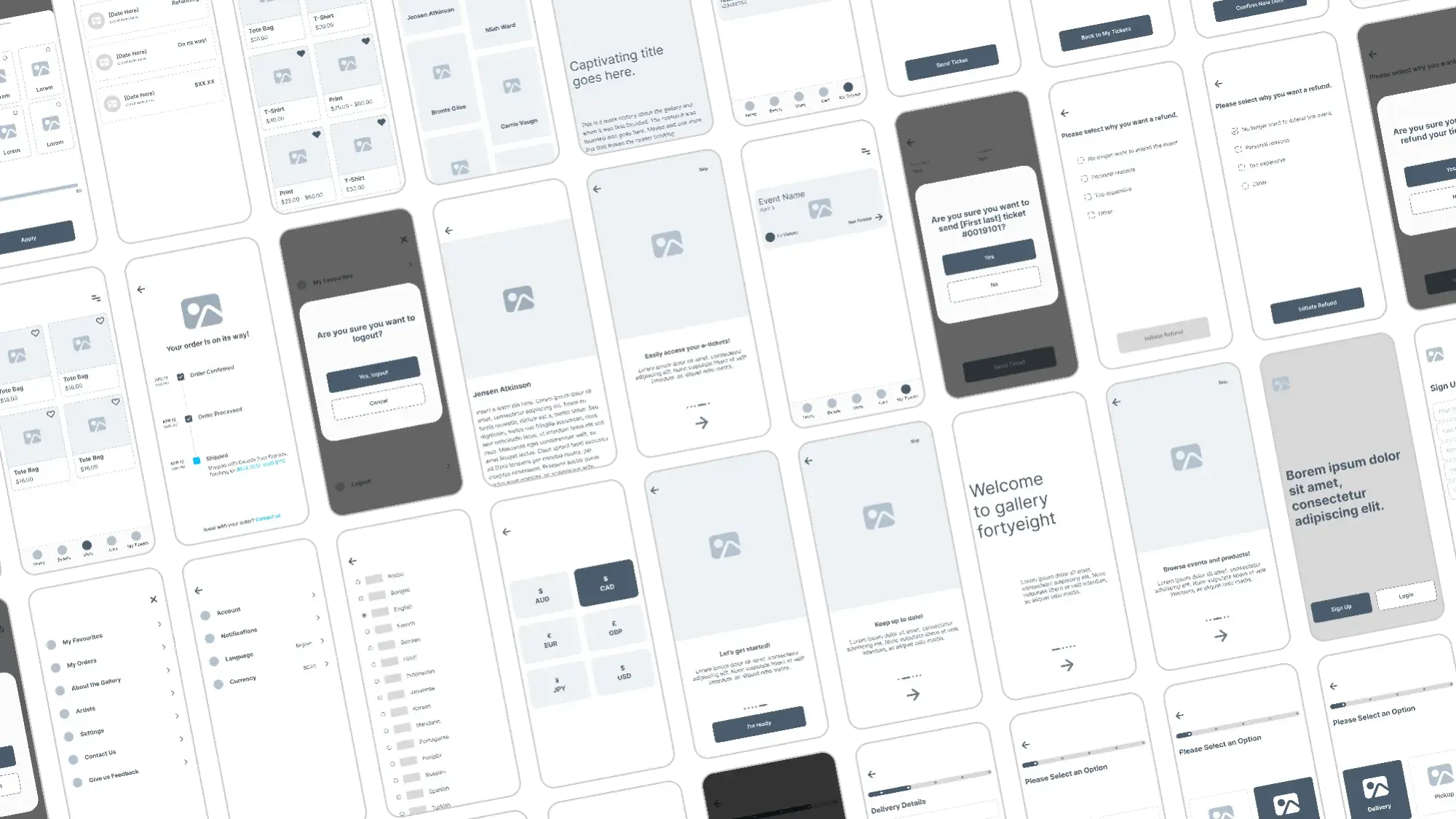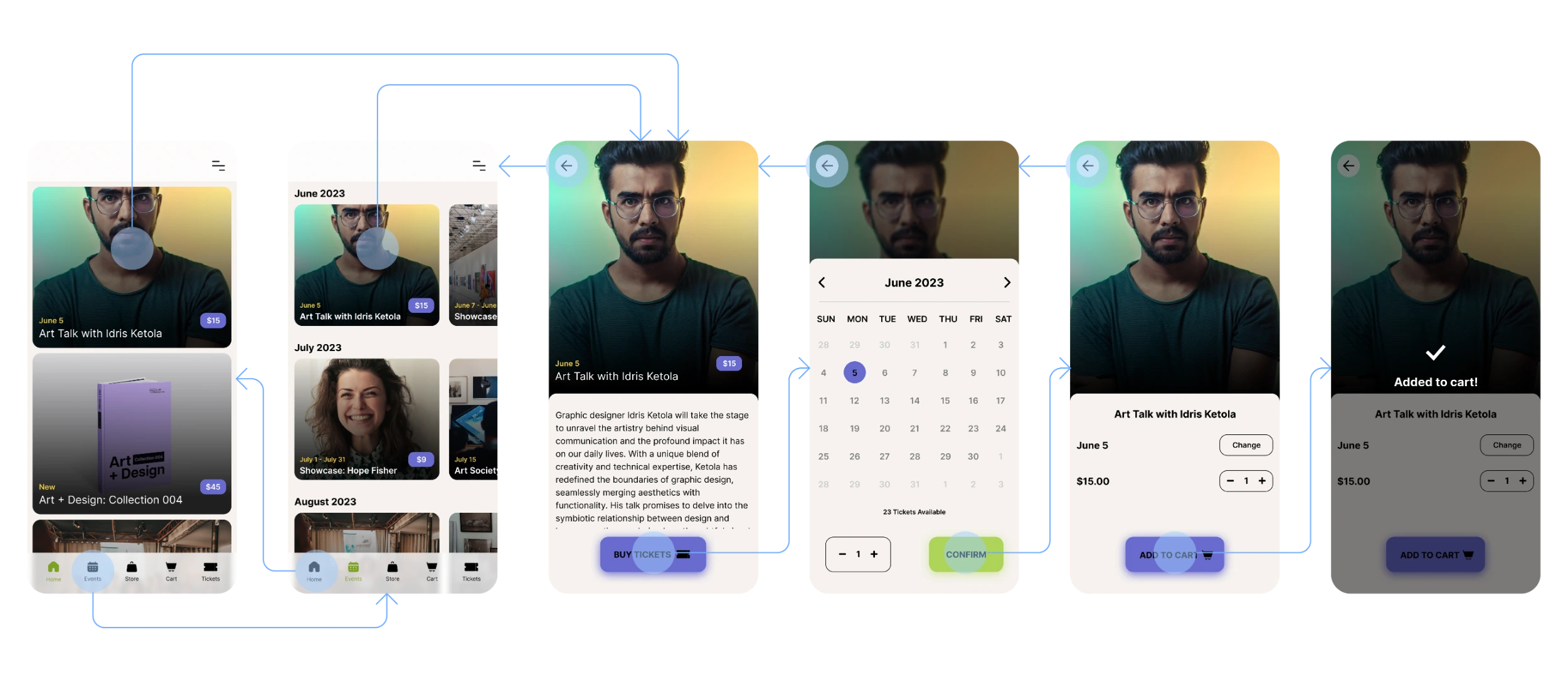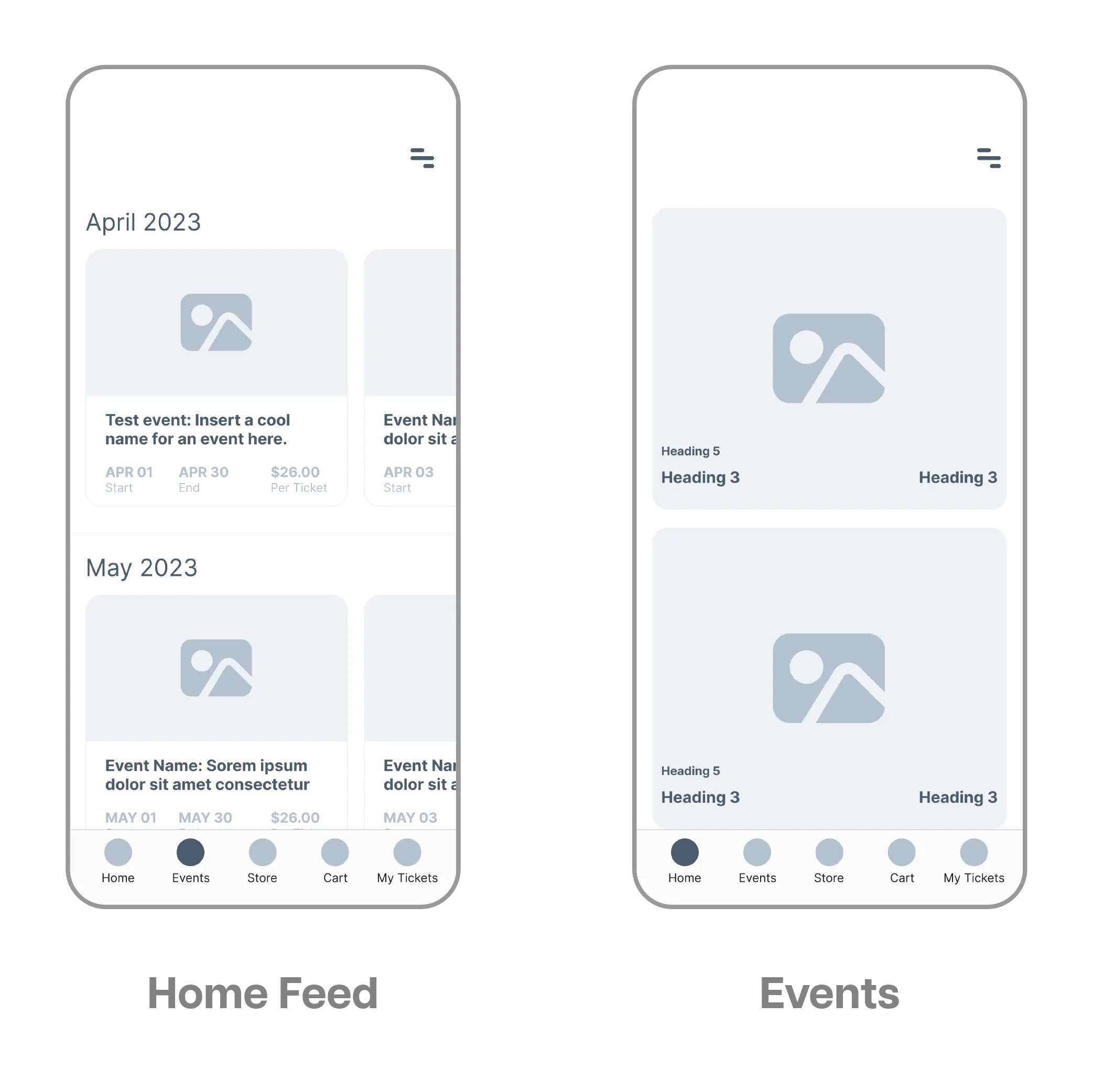 Simple and quick, we started the process with paper wireframes. They’re a great way quickly iterate initial ideas. We brainstormed variations of some of the main screens, like the home page, store, and events page. These paper wireframes set a foundation for low fidelity designs.