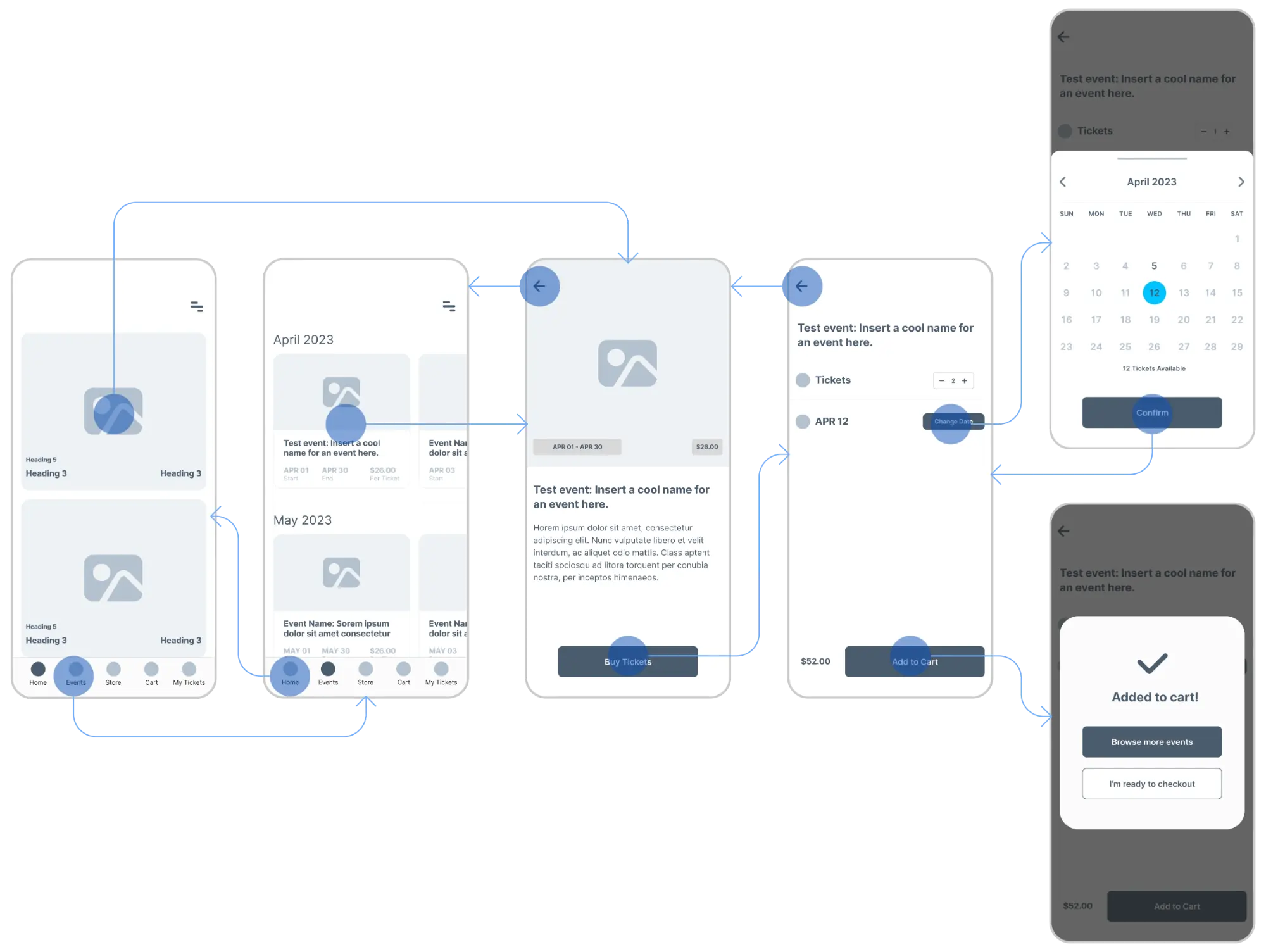 The next step was to turn our paper wireframes into low fidelity digital wireframes. This is where we introduced grids and organization to create appealing, but low detail, wireframes. Once created, we added interactions to the wireframes to create a basic prototype.